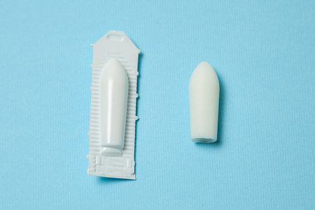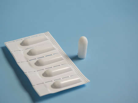 Suppository for anal or vaginal use on a blue background. Candles for treatment of hemorrhoids, temperature, thrush, inflammation