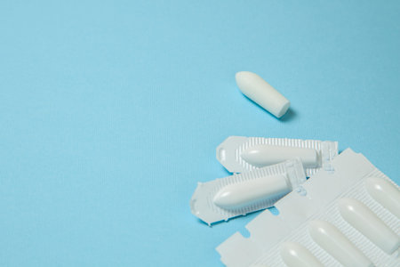 Suppository for anal or vaginal use on a blue background. Candles for treatment of hemorrhoids, temperature, thrush, inflammation. Copy space for text