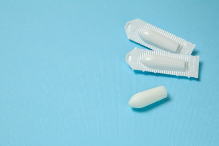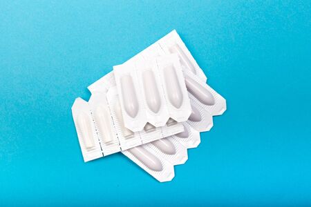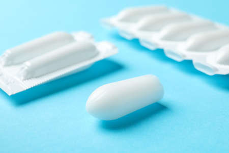 White suppositories for anal or vaginal use on blue background. Medical candles for treatment of Candida, thrush, hemorrhoids, inflammation and fever. Effective drug for timely treatment of diseases