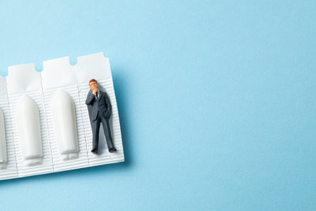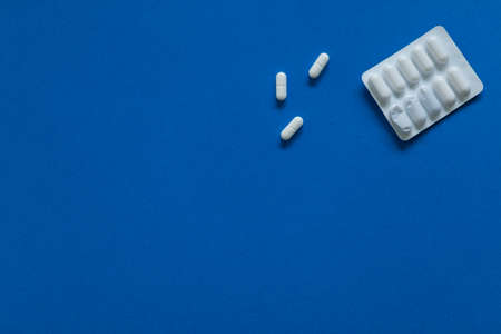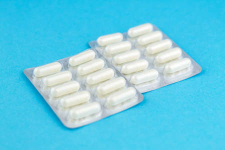 Packs of white capsules packed in blisters with copy space on blue background. Focus on foreground, soft bokeh.