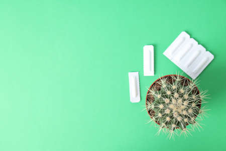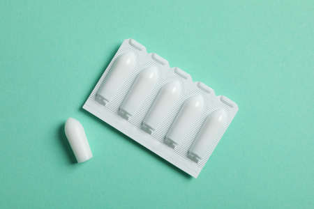 Plastic packaging with vaginal or rectal suppositories is on green background surrounded by round tablets that form ornament in polka dots. Concept photo treatment of proctological or gynecological