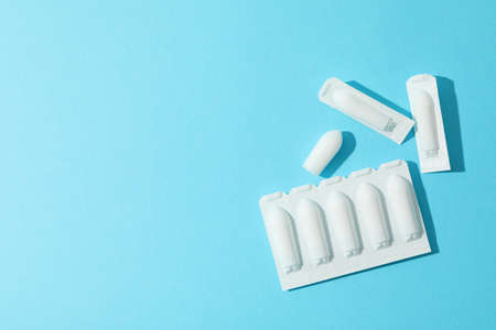 Medical Suppository, Rectal or Vaginal. Isolated on blue Background. Candles for treatment of hemorrhoids, inflammation, thrush, temperature. Copy space for text