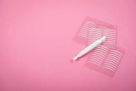 Artificial eyelid crease double tapes for hooded eyes on pastel rose pink background