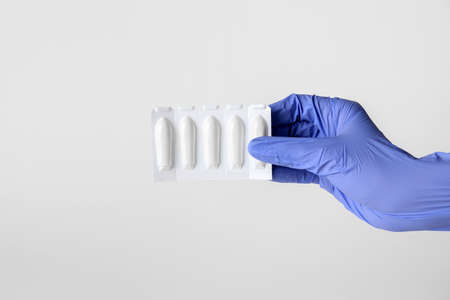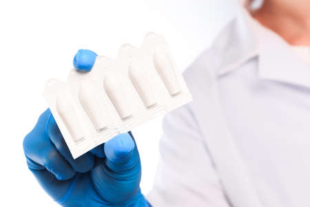 Doctor holds in his hand wearing a blue latex glove, medical candles with drugs, packed in a blister pack on white background close up.