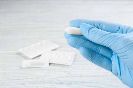 Suppository for anal or vaginal use in the hands of doctor in gloves. Candles for treatment of hemorrhoids, temperature, thrush, inflammation