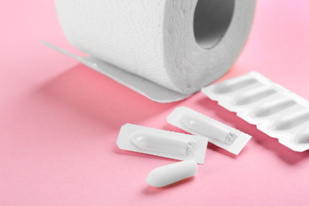 Suppositories and toilet paper on pink background, closeup view. Hemorrhoid treatment