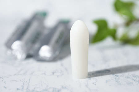 Medical, vaginal suppository on a pink background, for the treatment of hemorrhoids, candidiasis