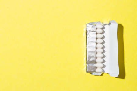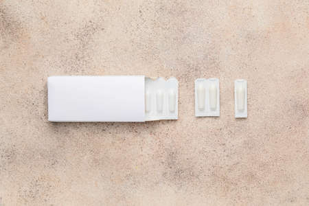 Packaging of medicines in form of suppositories are on yellow uniform background view from above with the clear area of half photo for labels, headers. Concept photo for pharmacy, treatment