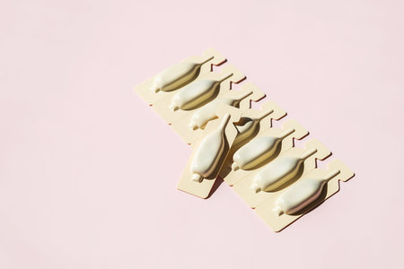 Gynecological medicines for women's health in form of suppository, capsules on pink background. Vulvovaginal infections treatment.