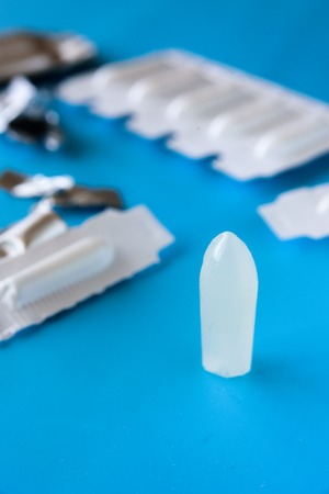 Suppository for anal or vaginal use on a blue background. Candles for the treatment of hemorrhoids, fever, thrush, inflammation