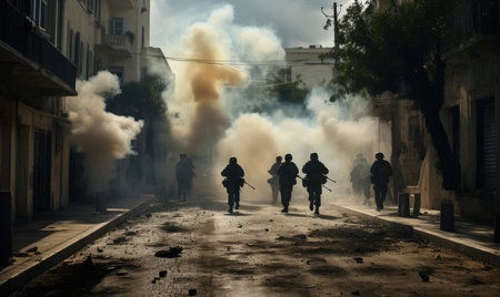 War Concept. Military silhouettes fighting scene on war fog sky background, World War Soldiers Silhouettes Below Cloudy Skyline At night. Attack scene. Armored vehicles. Tanks battle. Decoration