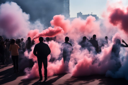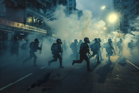 Protesters clash with police amid smoke and chaos, emphasizing conflict and social issues