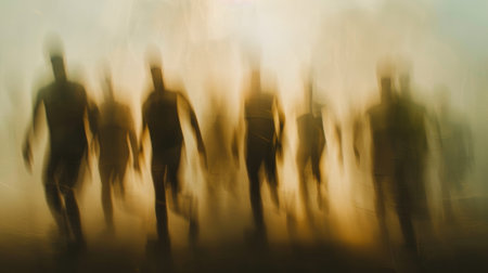 A crowd of people is silhouetted against a bright, undefined background. The image presents high contrast with dark figures and a stark white space. The composition emphasizes shadows and form, suggesting potential for use in a variety of visual concepts and artistic projects. Suitable for editorial and commercial applications.