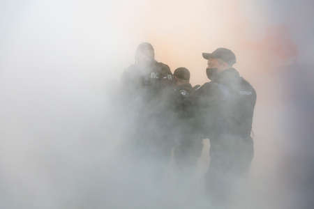 KYIV, UKRAINE - June 05 2020: Police in smoke and fog during the protest against the police violence in ukrainian capital