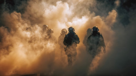 Military personnel in hazmat suits walking through toxic orange smoke cloud during chemical emergency response training or hazardous material incident.