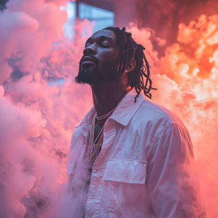A striking image featuring a man standing in a dramatic cloud of red smoke. The vivid colors create an immersive and atmospheric backdrop, highlighting emotion and artistic flair.