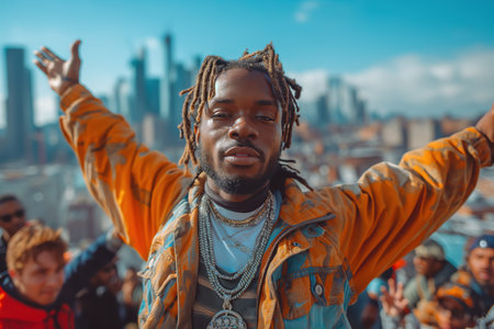 A man with dreadlocks stands confidently as he faces a large crowd.