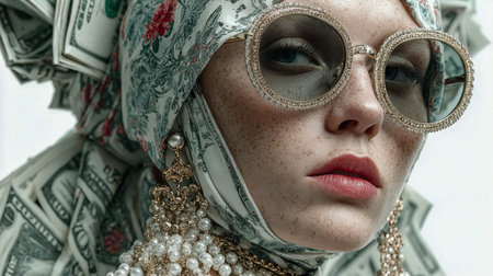 Stylish woman in sunglasses and headscarf made of dollar bills, wearing pearls and gold jewelry.