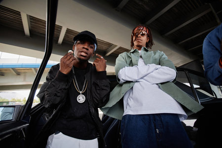 Young African American man in cap and black bomber jacket and his buddy in sunglasses and headband standing by car in front of camera