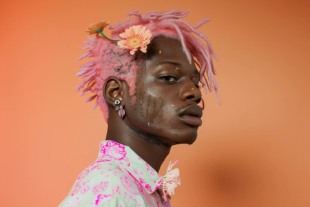 Unconventional Man with Pink Hair and Flower Standing in Front of Vibrant Orange Wall