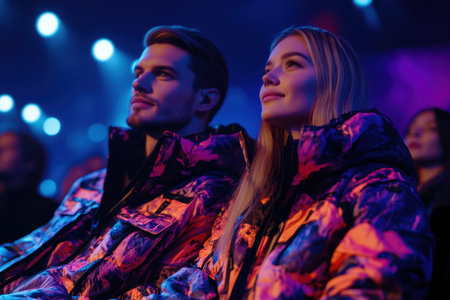 Two young adults sit together, captivated by a colorful event, dressed in fashionable jackets against a lively backdrop.