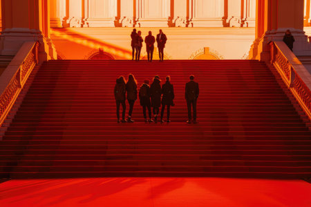 Warm orange light bathes a red-carpeted staircase, with silhouetted figures walking toward a grand interior