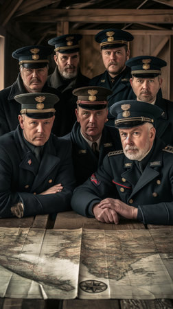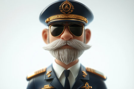 A charismatic animated captain character displays an air of authority while wearing a meticulously designed military uniform complete with epaulettes and sunglasses. His full beard adds to his distinct personality, capturing a sense of adventure.