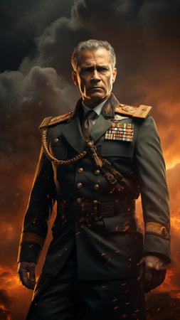 Powerful leader in outfit commanding a totalitarian group. Concept Totalitarian regime, Military leader