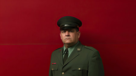 a military uniform stands out against a vibrant red background in this captivating photograph. inspired by noir comic art and contemporary chinese art, the image exudes simplicity and features a monochromatic color palette. the dreamlike realism and hyper-realistic portraiture create a visually striking composition. with a touch of queer academia, the low-angle perspective adds depth and intrigue to this unique piece. ai generated