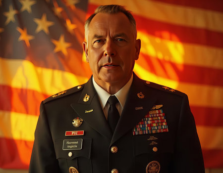 A close-up of a veteran in uniform with medals, seated in front of an American flag. Symbol of military service