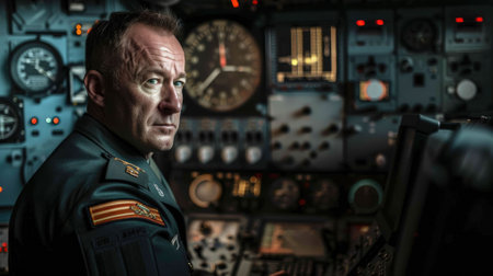 Portrait of a pilot in a ship's cabin. Shot in a ship's cabin.