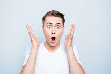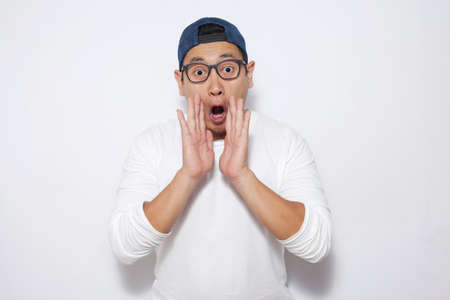 Portrait of young funny Asian man in white shirt, gesturing shocked or surprised expression with mouth open, while standing over white background