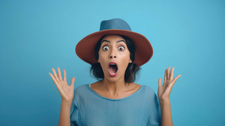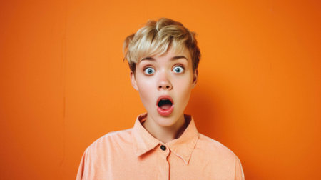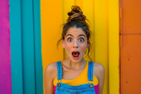A young woman stands against a backdrop of bright, multi-colored panels, her mouth wide open in astonishment and her hair casually styled. The playful hues reflect her lively spirit.