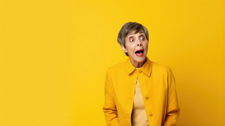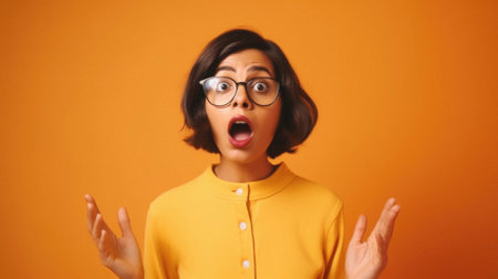 Shocked woman with yellow jacket on orange background.