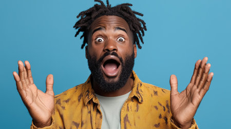 An African American male expresses surprise with wide eyes and open mouth against a blue studio background.