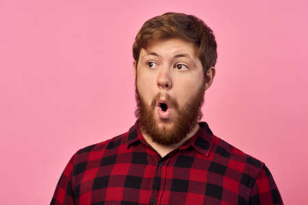 man with emotions on his face with a beard on a pink background, logo, copy space.