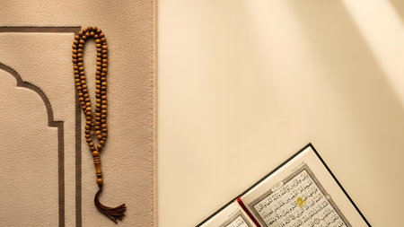 Top view prayer composition with tasbih along prayer mat edge and Quran partially visible, beige soft light. High quality photo