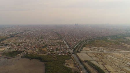 Aerial cityscape densely built asian city, seaport. urban environment in asia. modern city Surabaya with buildings and houses. Surabaya capital city east java, indonesia