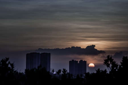 Jakarta, Indonesia - April 6, 2019 : The sky in Regatta Apartment changes from minute to a minute then the golden disc is already touching the surface of the coast apartment