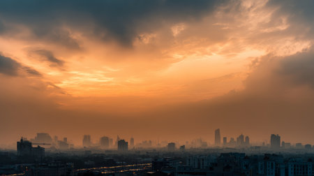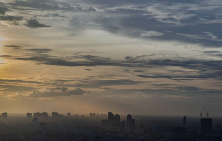 Natural Sunset in evening downtown silhouette at bangkok. Bright Dramatic Sky And Dark Ground. city Landscape Under Scenic Colorful Sky At Sunset. Sun Over Skyline, Horizon. Light blue background.