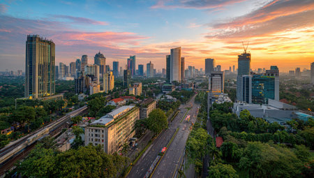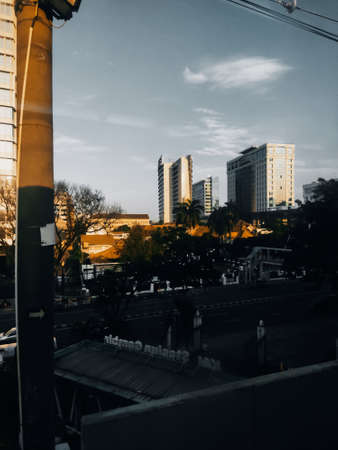 Indonesian morning view in the city of Jakarta during a beautiful morning with sunrise and tall buildings