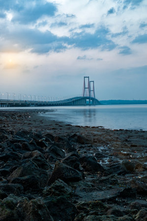 Suramadu Bridge at sunset and the street lights are starting to come on