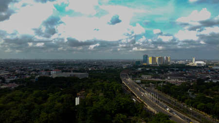 Bekasi. Indonesia. March 8 2020 : Aerial view of highways and tall buildings with beautiful blue sky