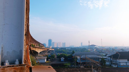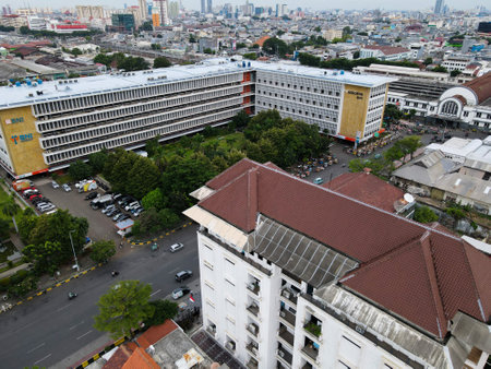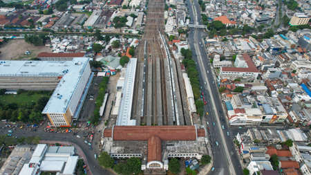 Aerial view of Jakarta Kota Train Station with Jakarta cityscape background. JAKARTA, INDONESIA - MAY, 18, 2021