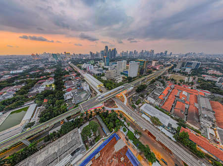 JAKARTA - Indonesia. June 25, 2019: Aerial view of dense buildings in Jakarta city at sunset time