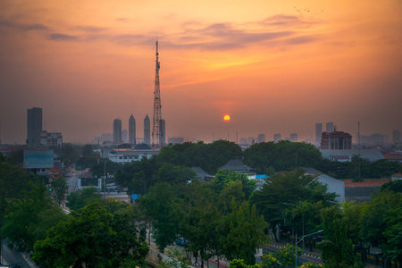 Sunset over residential district of Jakarta with the modern office towers in the background in Indonesia capital city