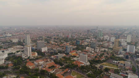 Aerial cityscape modern city Surabaya with skyscrapers, buildings and houses. sunset in city skyline with skyscrapers and business centers Surabaya capital city east java, indonesia