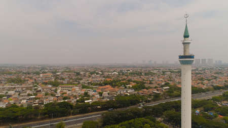 aerial view minaret mosque Al Akbar against city Surabaya highway, skyscrapers, buildings and houses. mosque in Indonesia Al Akbar in Surabaya, Indonesia. beautiful mosque with minarets on island Java Indonesia.