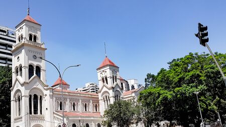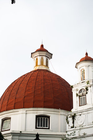 Big red dome of curch in Kota Lama, Semarang City, Indonesia. Vintage historical church white sky background