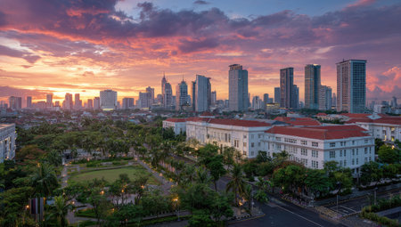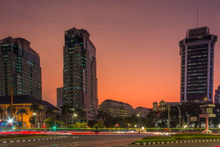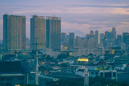 Indonesian morning view in the city of Jakarta during a beautiful morning with sunrise and tall buildings